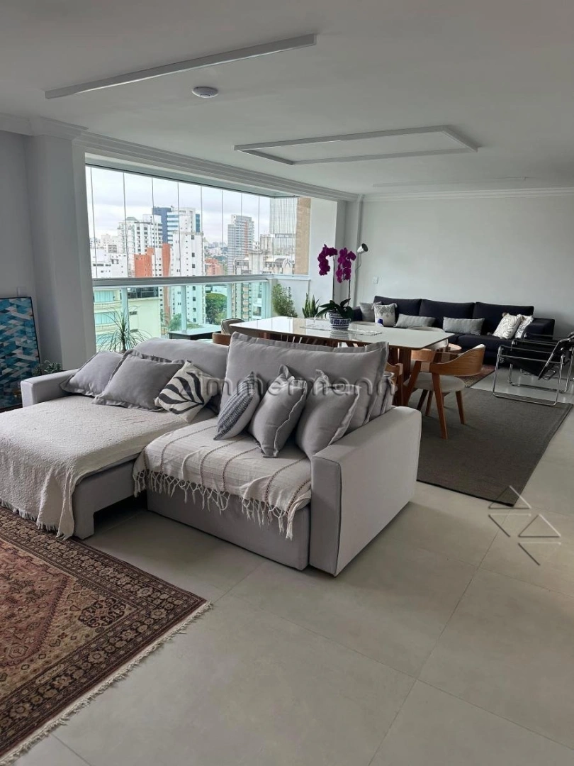 Apartamento de 200m² de área útil desenhado para quem valoriza espaço. A planta oferece uma sala social robusta com três ambientes distintos, ideal para receber, e uma sala de TV com banheiro privativo (que pode ser revertido em uma suíte adicional ou escritório). A área íntima é composta por uma suíte e um quarto, totalizando duas dormitórios e um lavabo, além de um banheiro social. A dependência completa (quarto e banheiro de serviço) e a cozinha com armários são diferenciais práticos.