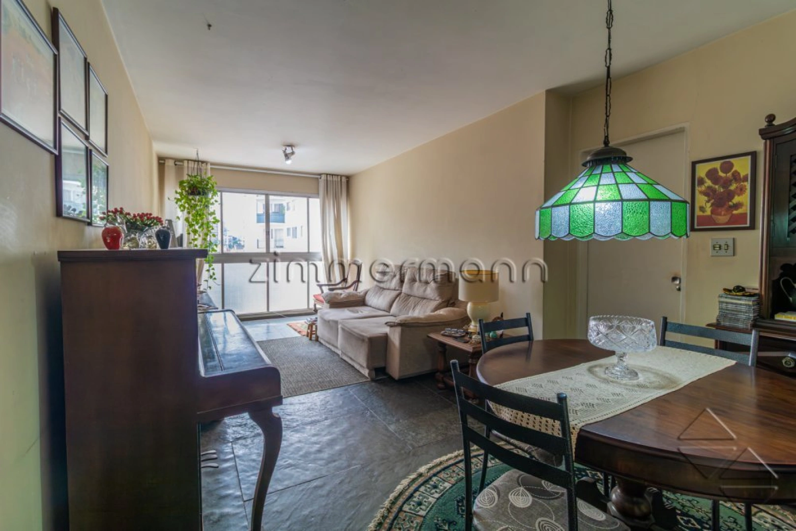 A sala ampla para dois ambientes conta com janelões do piso ao teto, proporcionando excelente iluminação natural e sensação de amplitude. O imóvel possui 2 dormitórios, sendo 1 suíte, além de cozinha funcional e área de serviço com dependência de apoio.