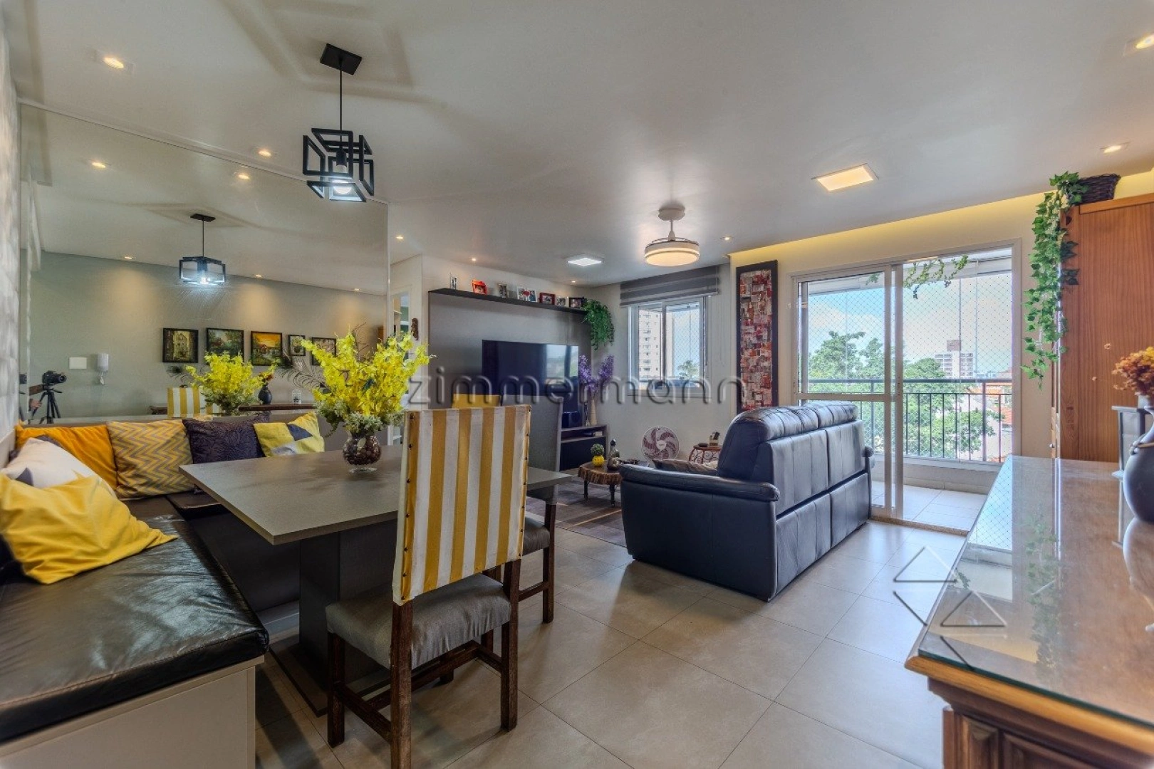 Apartamento com living para 2 ambientes, ampla varanda, cozinha, 3 dormitórios ( sendo 1 suíte ), banheiro social e área de serviço. Planta original com três dormitórios, mas hoje a sala foi ampliada e o terceiro dormitório já não existe. Apartamento de fundos com sol da manhã.